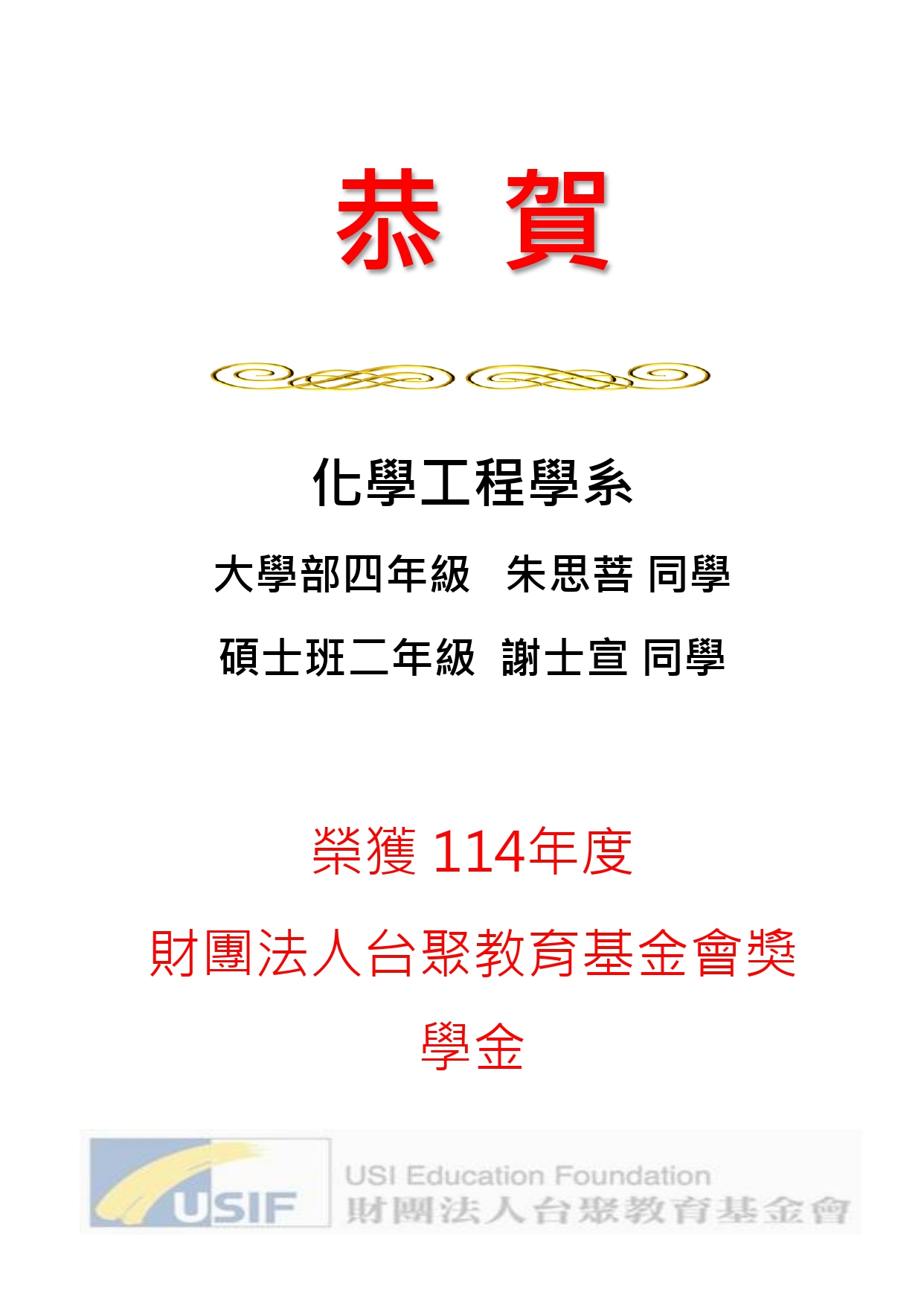 【學生榮譽】恭賀!!! 化學工程學系「朱思菩」、「謝士宣」同學 榮獲 114年度財團法人台聚教育基金會獎學金