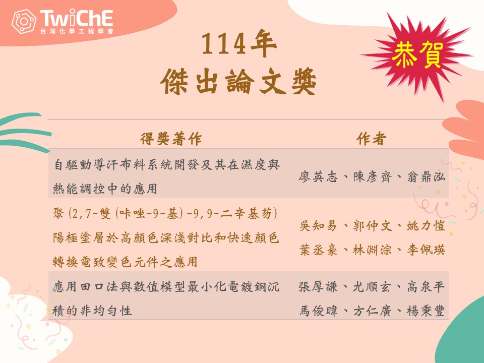 【學生榮譽】恭賀!!! 張厚謙老師之研究生「尤順玄」、「高泉平」、「馬俊暐」同學榮獲114學年度 台灣化學工程學會 傑出論文獎