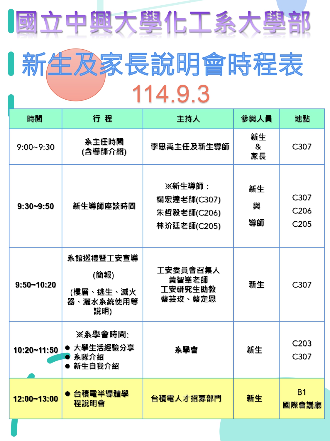 國立中興大學化工系大學部 新生及家長說明會時程表