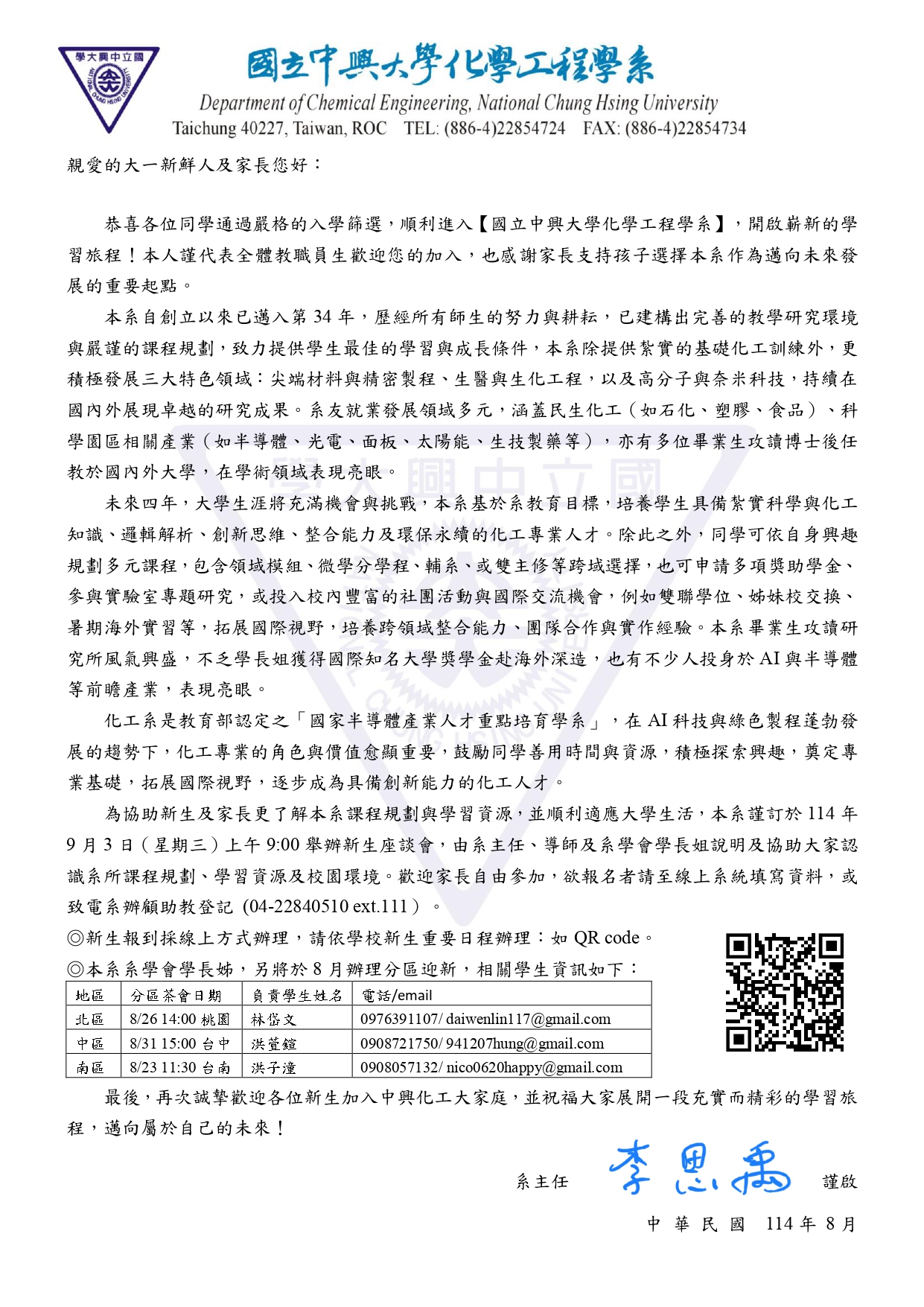 國立中興大學化工系 40227台中市南區興大路145號「工程三館-化工暨材料大樓」 che@nchu.edu.tw TEL:04-22854724 FAX:04-22854734
