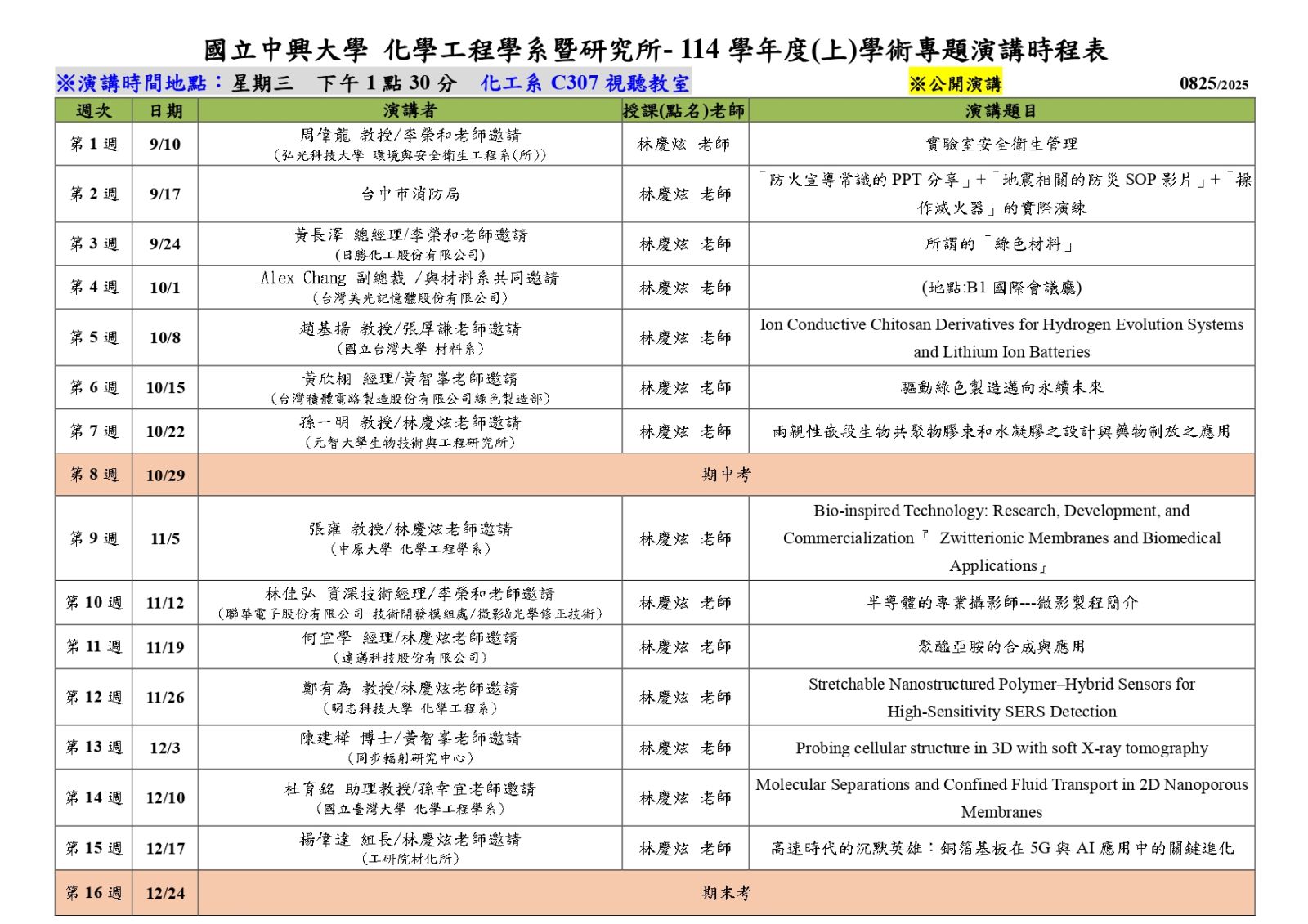 【課程公告】114學年度第1學期 學術專題演講時程表