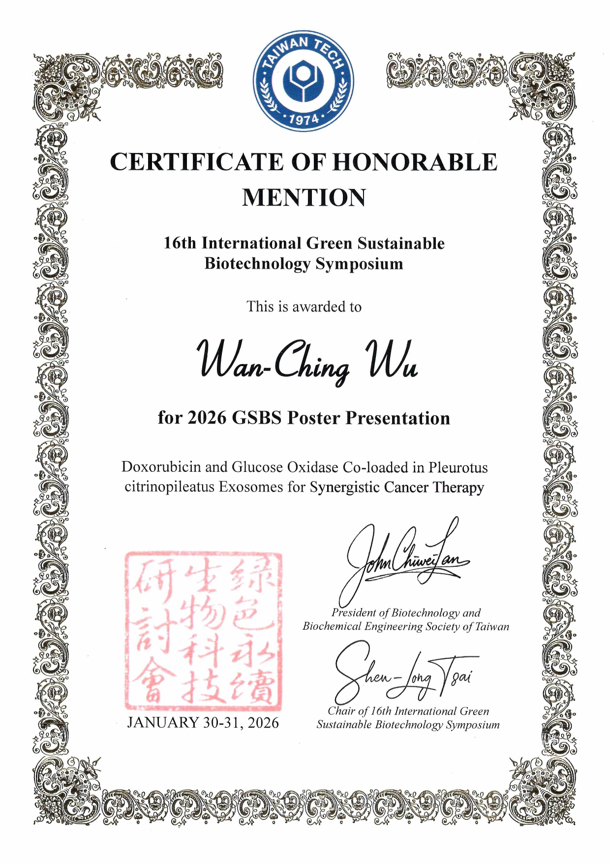 【學生榮譽】恭賀!!! 劉永銓老師指導學生江紫㚬、陳琬婷、吳宛靜同學榮獲2026國際綠色永續生物科技研討會海報發表及競賽「佳作」