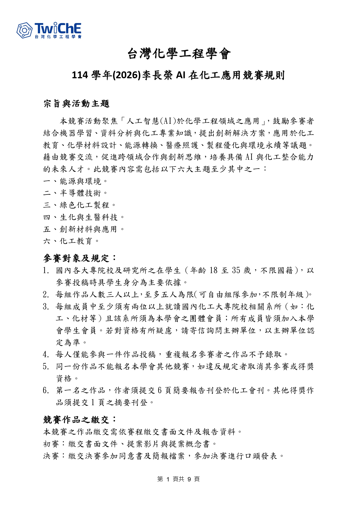 檢送第一屆「李長榮AI在化工應用競賽」規則,歡迎貴系鼓勵同學組隊參加!