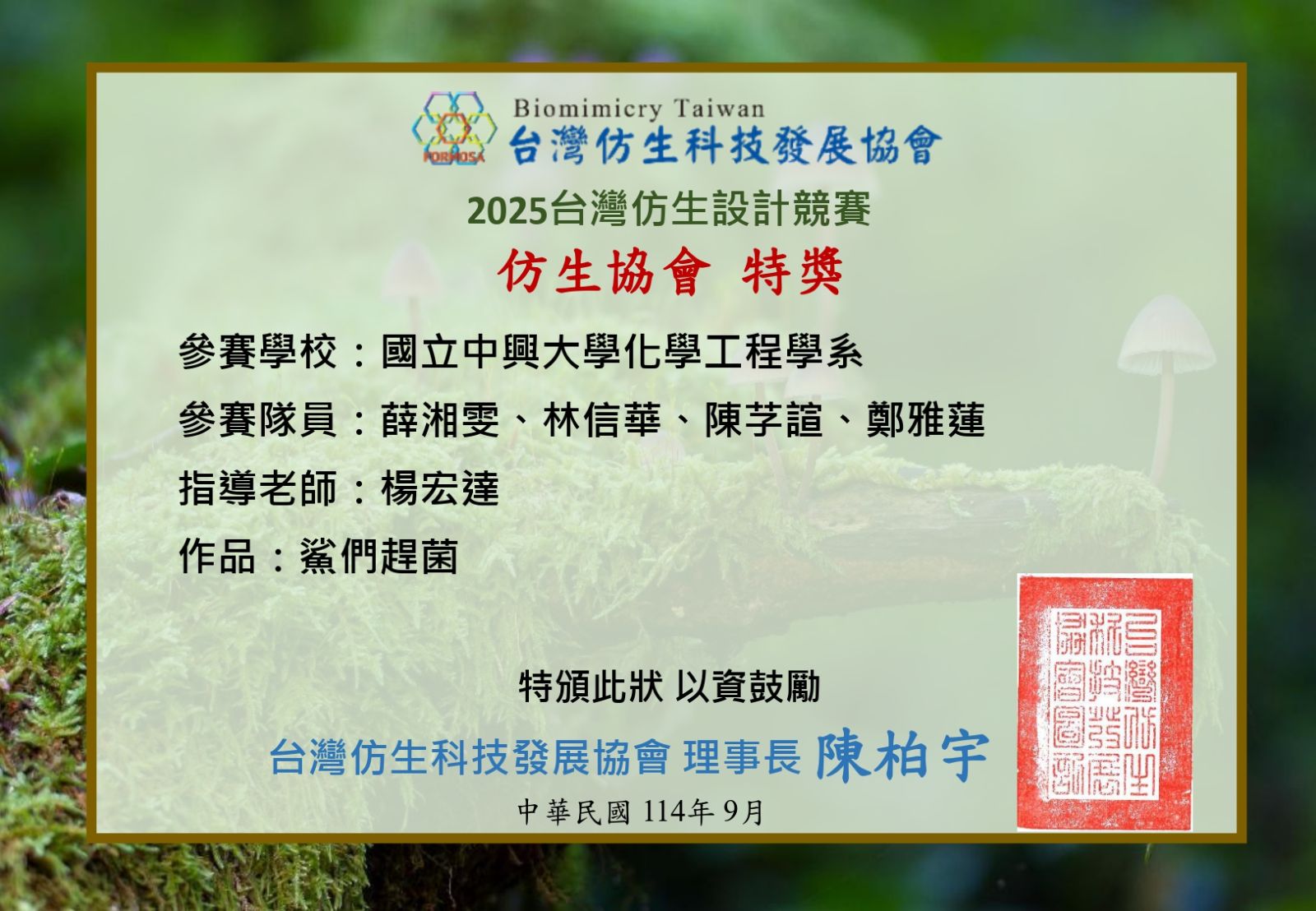 【學生榮譽】恭賀!!! 楊宏達老師指導之研究生「薛湘雯」、「林信華」、「陳芓諠」、「鄭雅蓮」同學 榮獲 2025台灣仿生設計競賽-仿生協會 特獎!!
