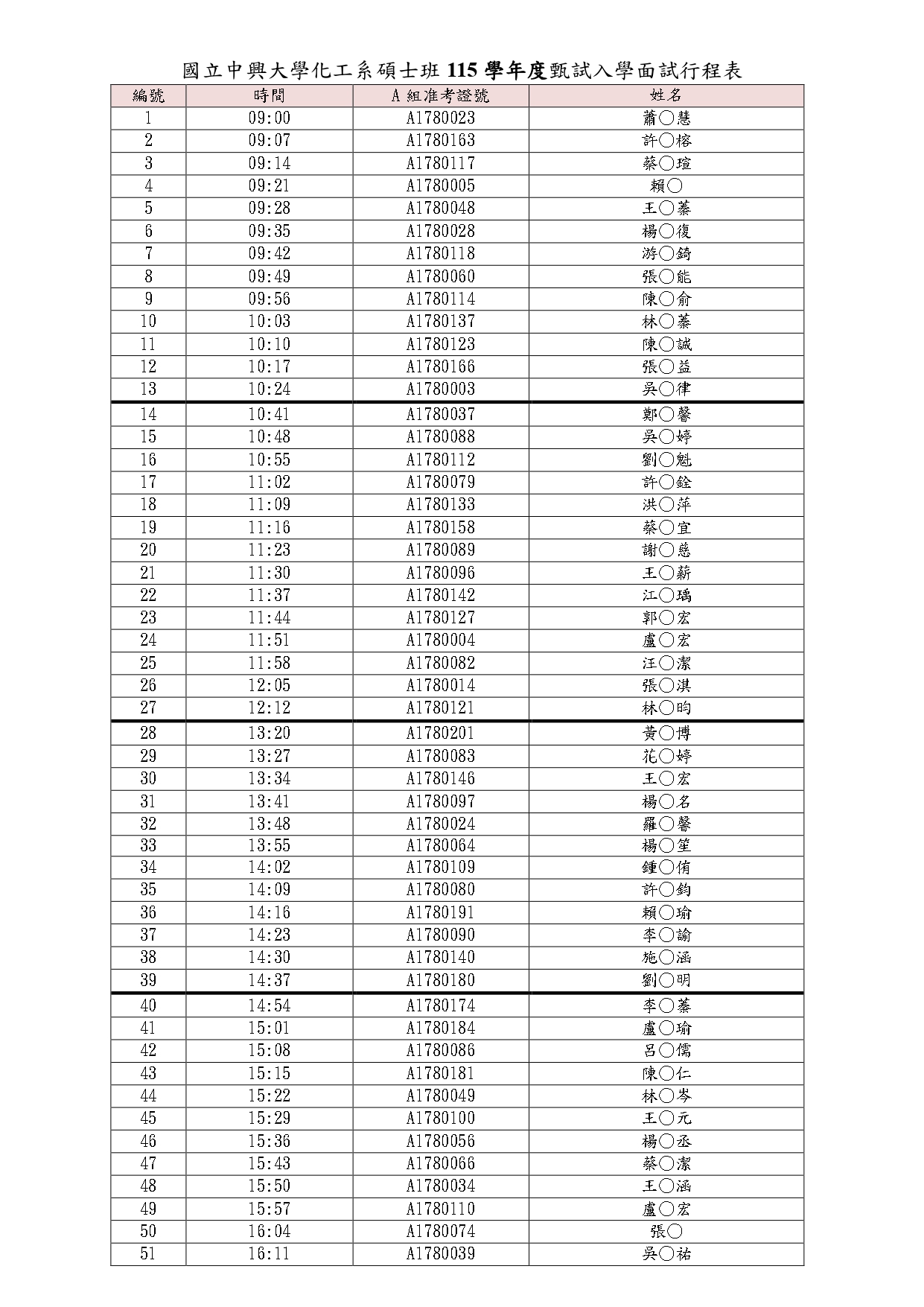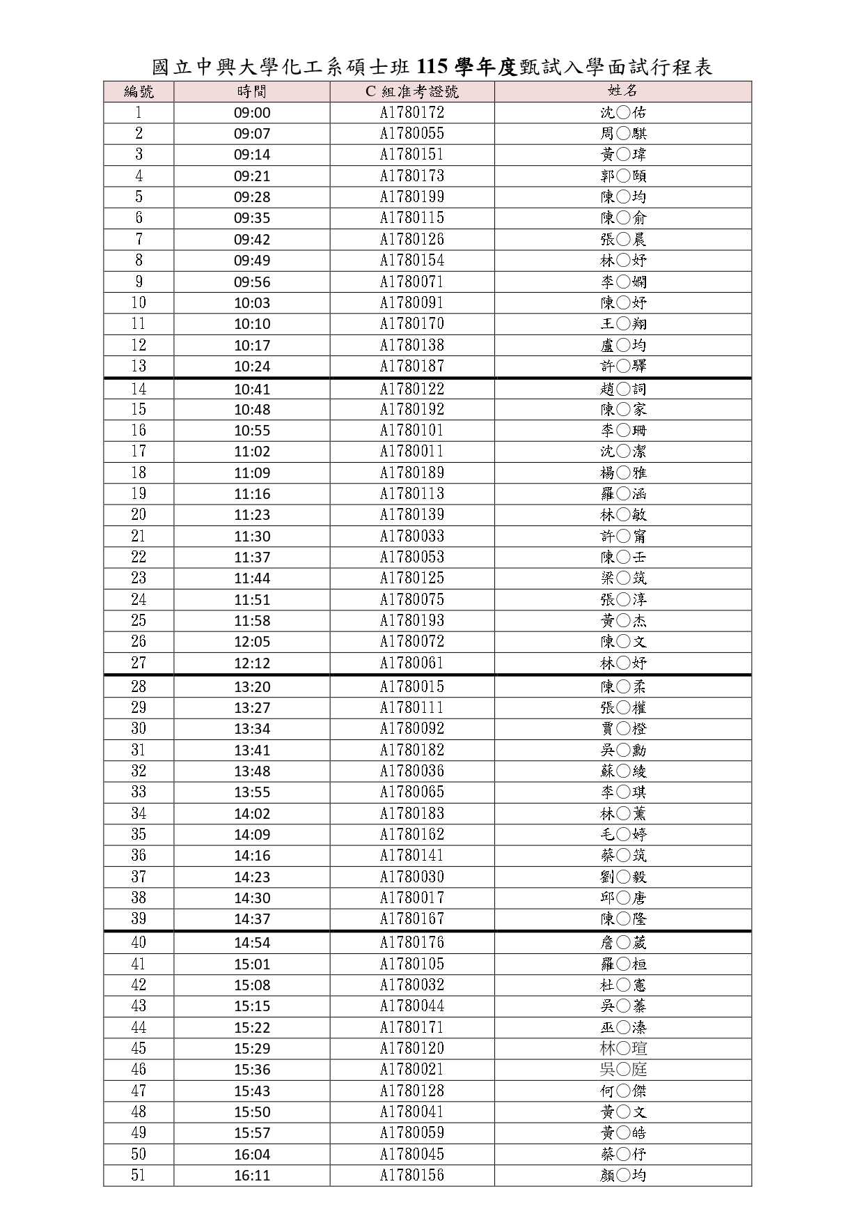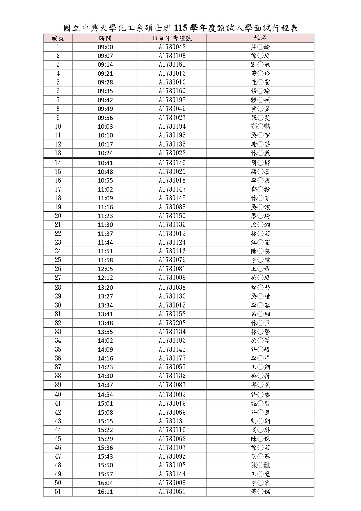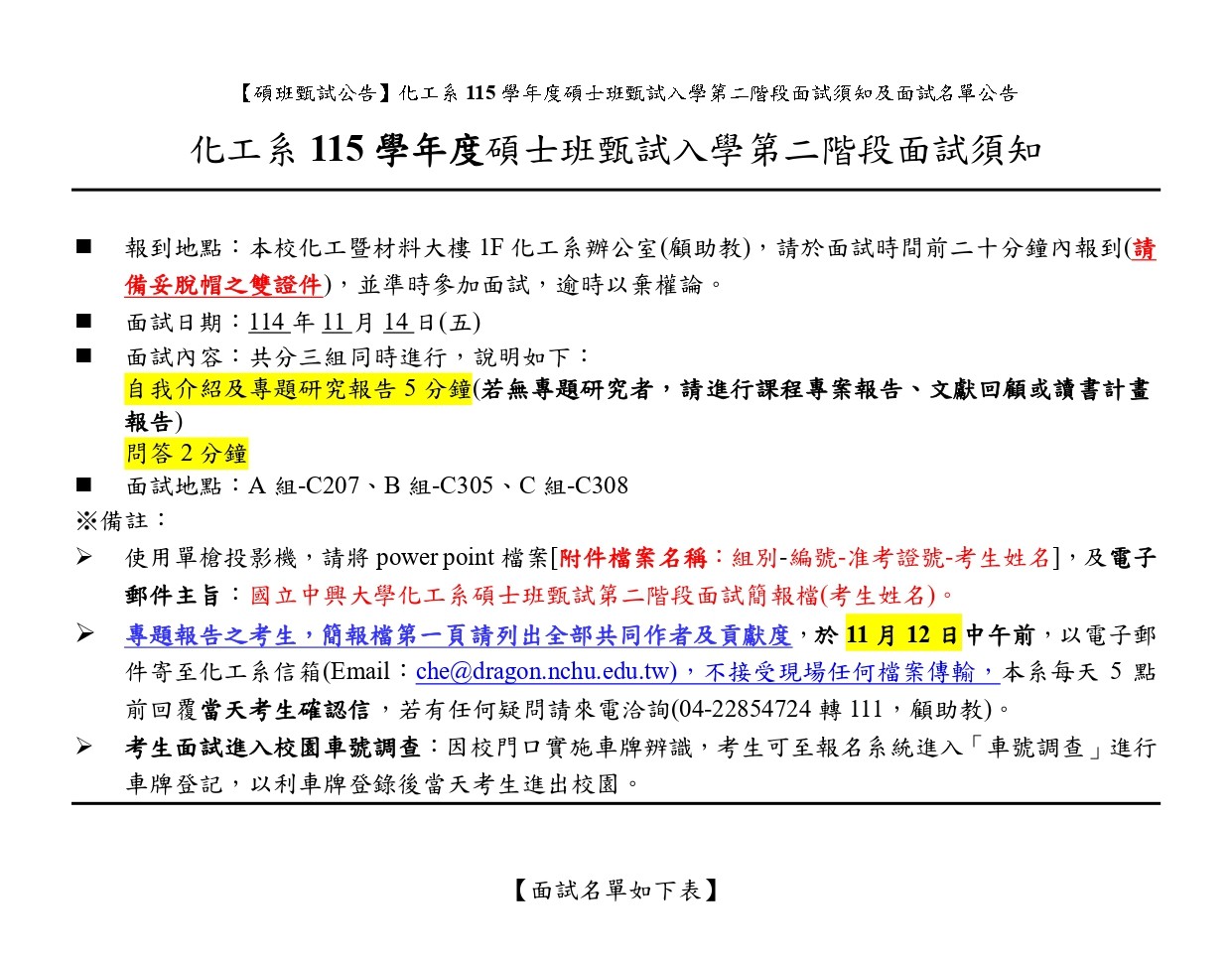 化工系115學年度碩士班甄試入學第二階段面試須知及面試名單