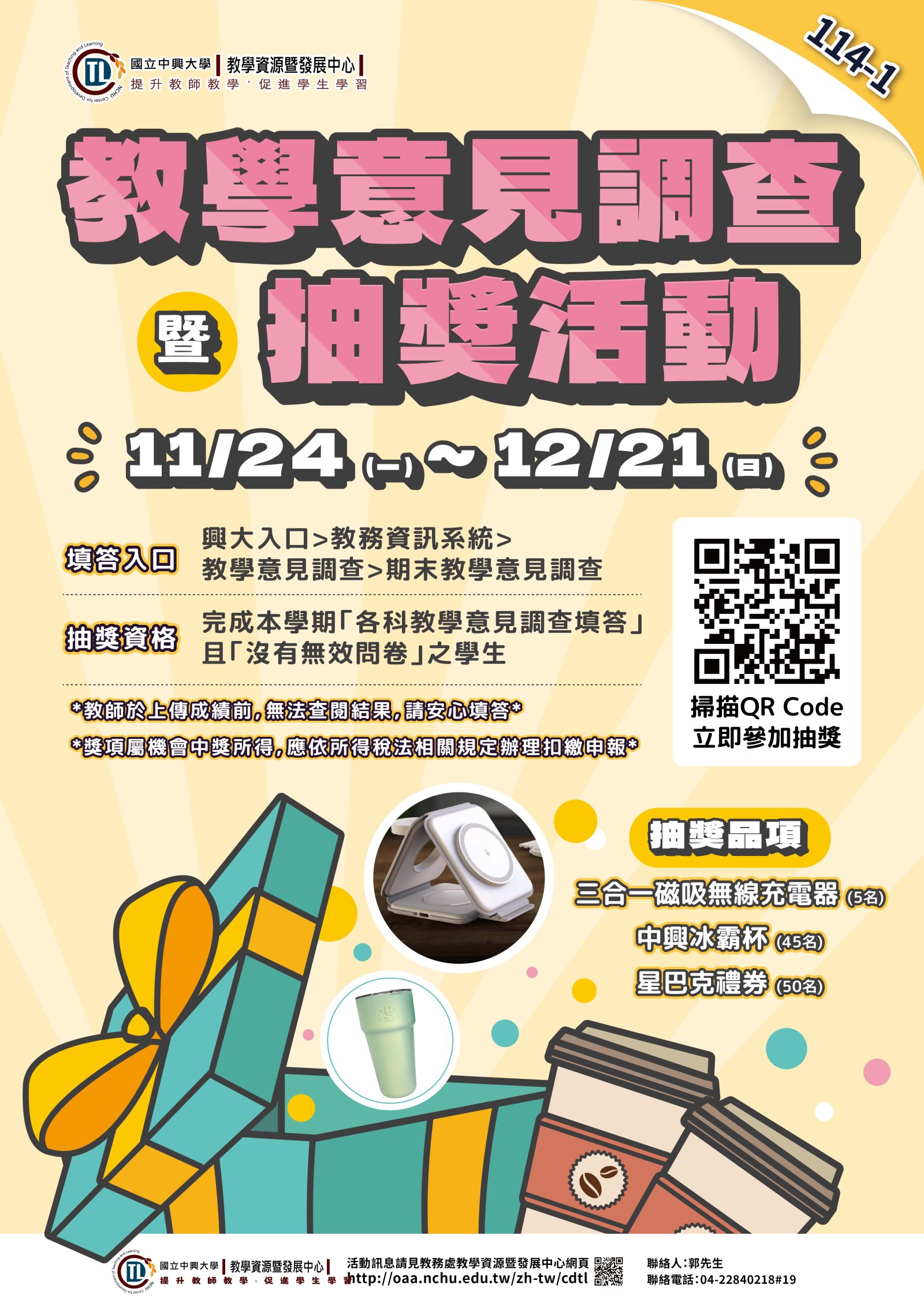 二、抽獎資格:本校學生完成本學期所修習之各科課程「教學意見調查填答」且「沒有無效問卷」者。